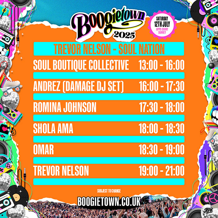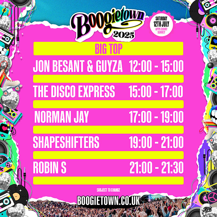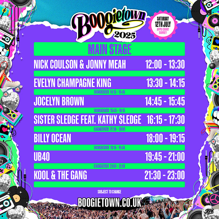 The countdown is officially on — just 10 days to go until the return of Boogietown Festival, the UK’s ultimate celebration of disco, funk, and soul. Taking place on Saturday 12th July at the picturesque Apps Court in Walton-On-Thames, Surrey, the stage times have just dropped — and it’s time to start planning your perfect day.