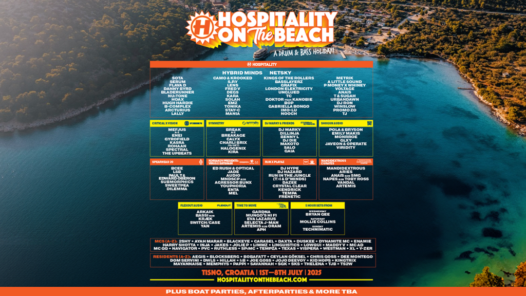 Hospitality On The Beach is making its grand return to Tisno, Croatia on 1st – 8th July 2025 for a 7-day drum & bass holiday. Today they announce their complete 2025 lineup including partners and legendary headliners Hybrid Minds, Netsky, Kings Of The Rollers, A Little Sound and more.