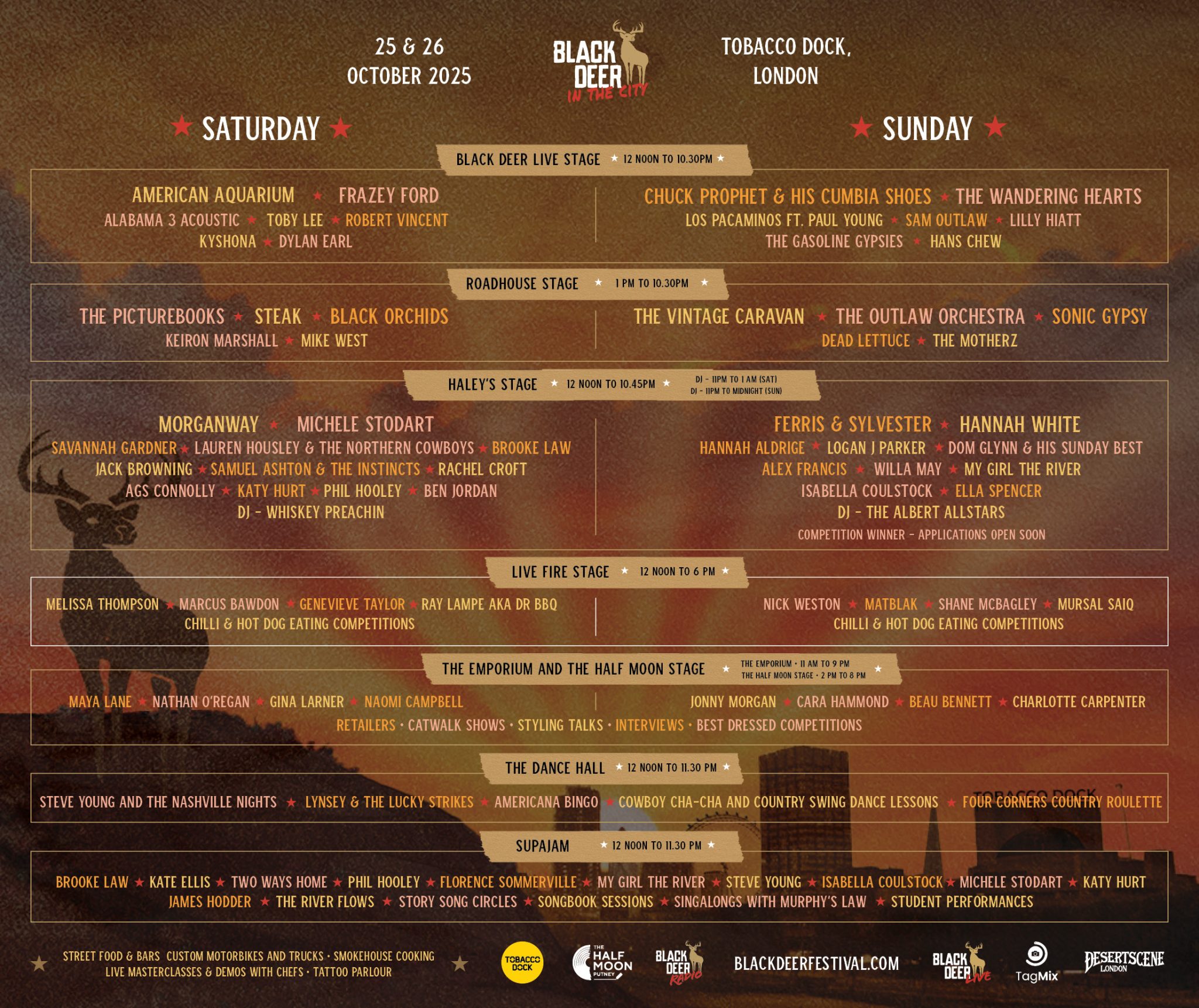Across three live stages – Black Deer Live, the ever-welcoming Haley’s Bar, and the legendary Roadhouse curated by London tastemakers Desertscene – more than 50 artists will perform. Expect everything from raw country and blues to Americana soul and raucous rock ’n’ roll, all handpicked to capture the true Black Deer sound.
