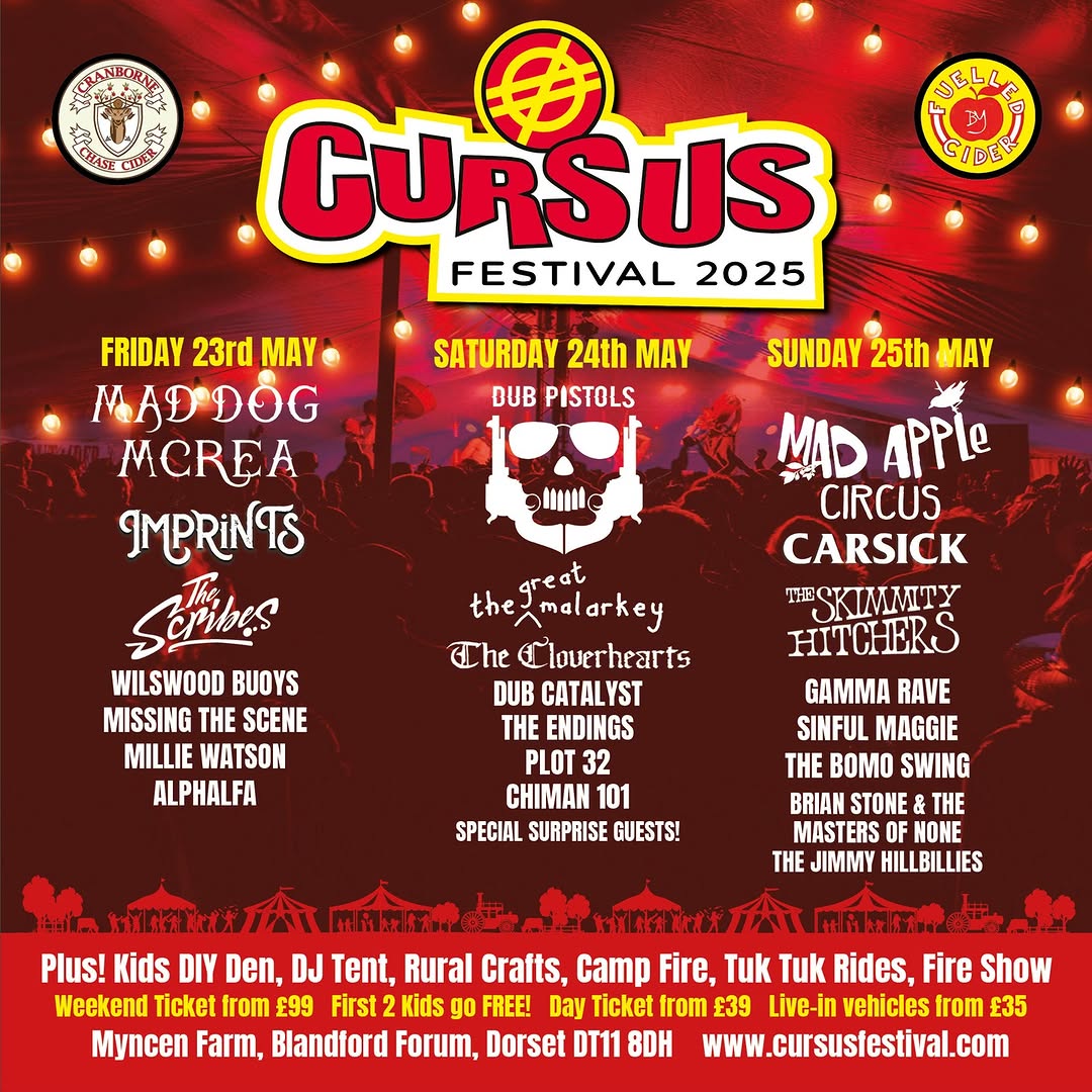 Cursus Festival brings you a brilliant mix of authentic live acts – regional, national, and global!. This year’s headliners were MAD DOG MCREA (Friday), DUB PISTOLS (Saturday), and MAD APPLE CIRCUS (Sunday), joined by a fantastic lineup including Carsick, Skimmity Hitchers, The Great Malarkey, Imprints, The Cloverhearts, The Scribes, Dub Catalyst, Sinful Maggie, The Endings, Gamma Rave, Plot 32, Brian Stone & The Masters Of None, Millie Watson, Missing The Scene, Chiman 101, The Jimmy Hillbillies, Alphalpha – and VERY SPECIAL MYSTERY GUESTS “Richard & The Heads”!