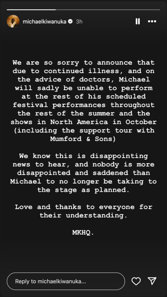 “We are so sorry to announce that due to continued illness, and on the advice of doctors, Michael will sadly be unable to perform at the rest of his scheduled festival performances throughout the rest of the summer and the shows in North America in October (including the support tour with Mumford & Sons,” the statement began.